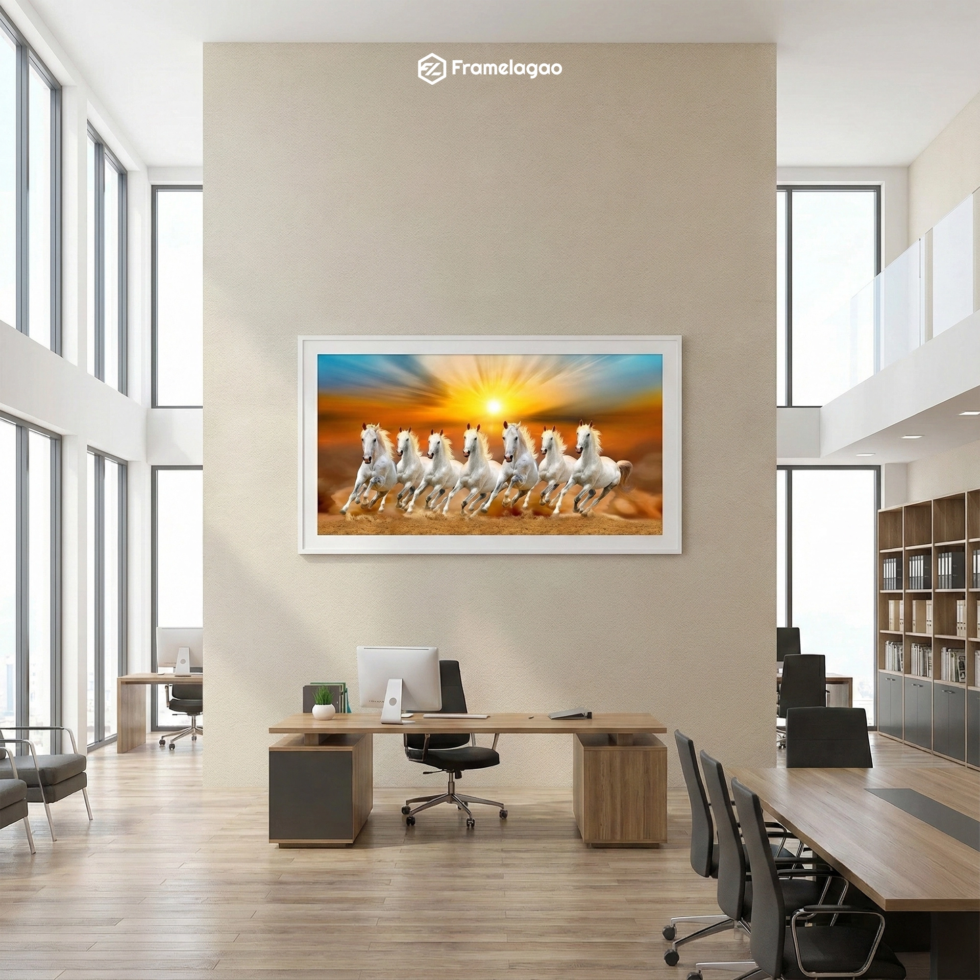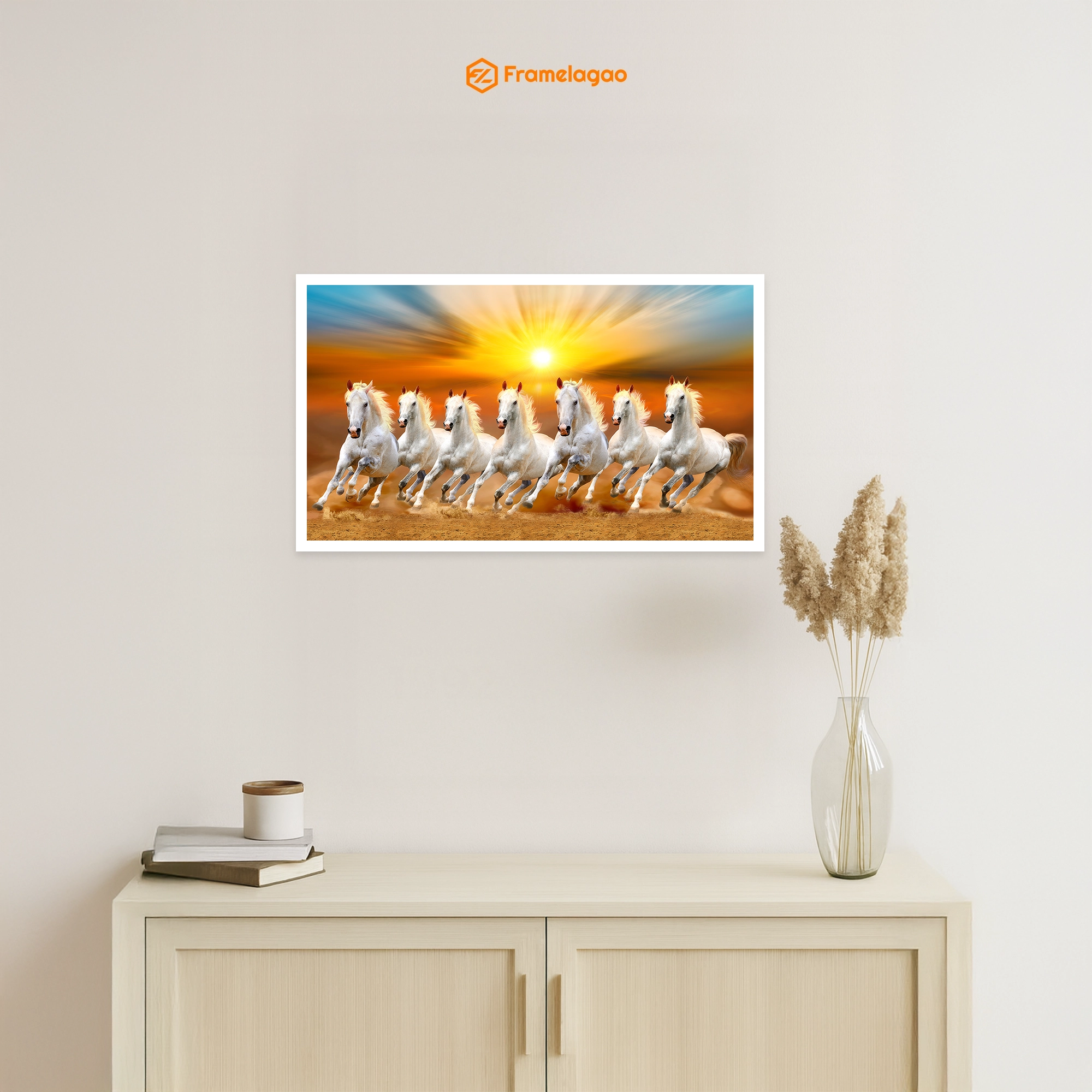 The Seven Horses Photo Frame is one of the most powerful and popular Vastu décor elements used in homes and offices to attract success, growth, and financial stability. Seven running white horses represent speed, confidence, positivity and unstoppable progress. This artwork features all seven horses running forward under a beautiful rising sun, symbolizing victory and new beginnings.